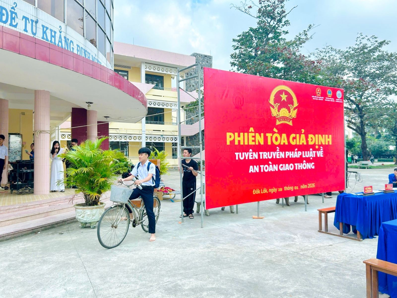Sáng thứ Hai ngày 20/01/2026, trong không khí chào cờ đầu tuần trang nghiêm, Chi đoàn số VII - Tòa án nhân dân tỉnh Đắk Lắk đã phối hợp chặt chẽ với Chi đoàn Viện kiểm sát nhân dân khu vực 13 Đắk Lắk tổ chức thành công Phiên tòa giả định nhằm tuyên truyền, phổ biến giáo dục pháp luật về trật tự, an toàn giao thông (ATGT) đến với học sinh THPT.