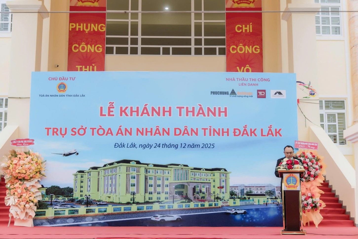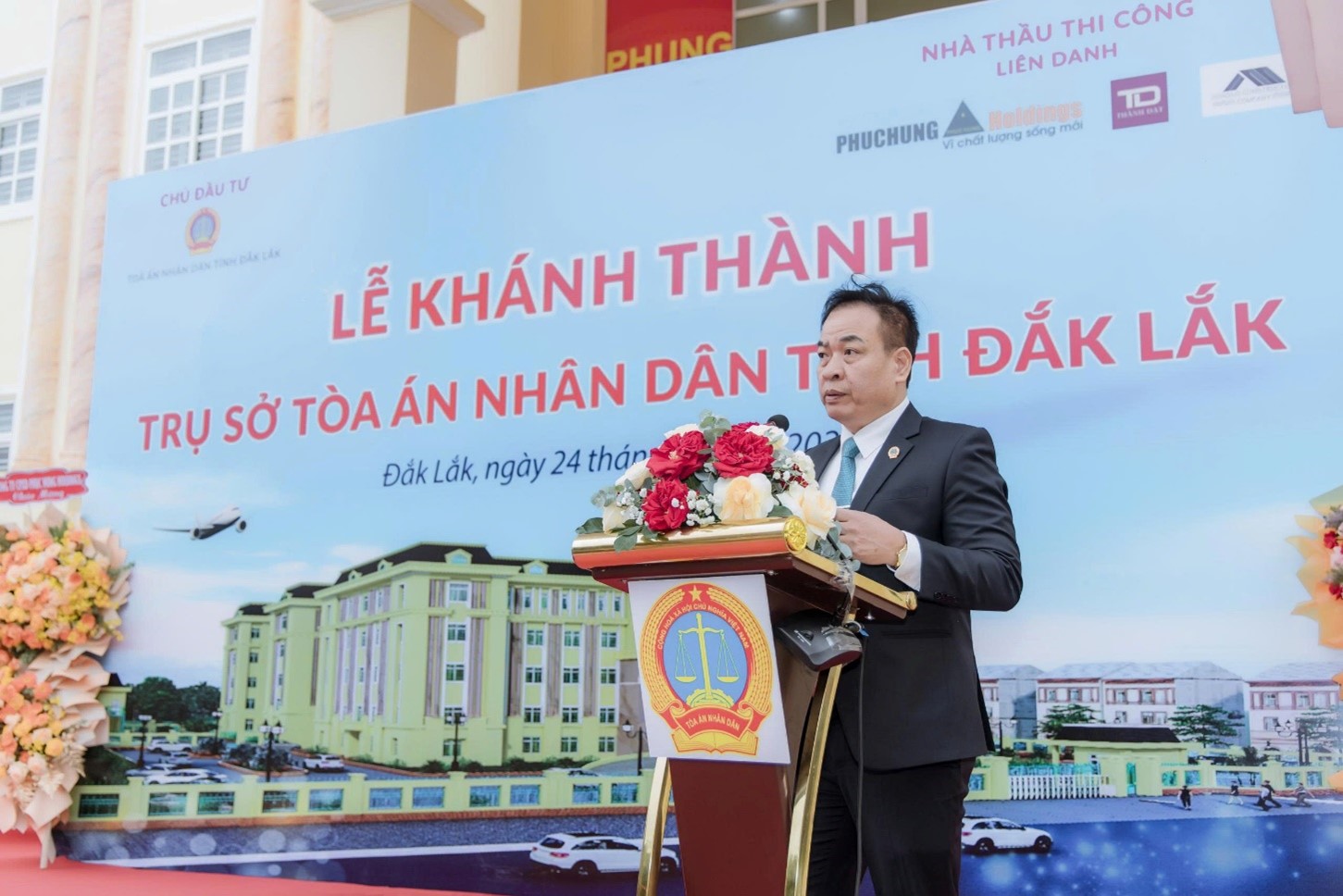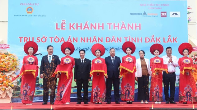 Sáng ngày 24 tháng 12 năm 2025, trong không khí hân hoan và phấn khởi của toàn thể cán bộ, công chức, người lao động TAND tỉnh Đắk Lắk và với sự có mặt chung vui của Lãnh đạo TANDTC, Thường trực Tỉnh ủy Đắk Lắk, TAND các khu vực, các cơ quan, ban, ngành trong tỉnh. TAND tỉnh và liên doanh các nhà thầu thi công (Công ty TNHH Kinh doanh Thành Đạt, Công ty Cổ phần Xây dựng Phục Hưng Holdings, Công ty Cổ phần Tư vấn đầu tư xây dựng Sông Lô) đã phối hợp tổ chức lễ khánh thành trụ sở làm việc TAND tỉnh.