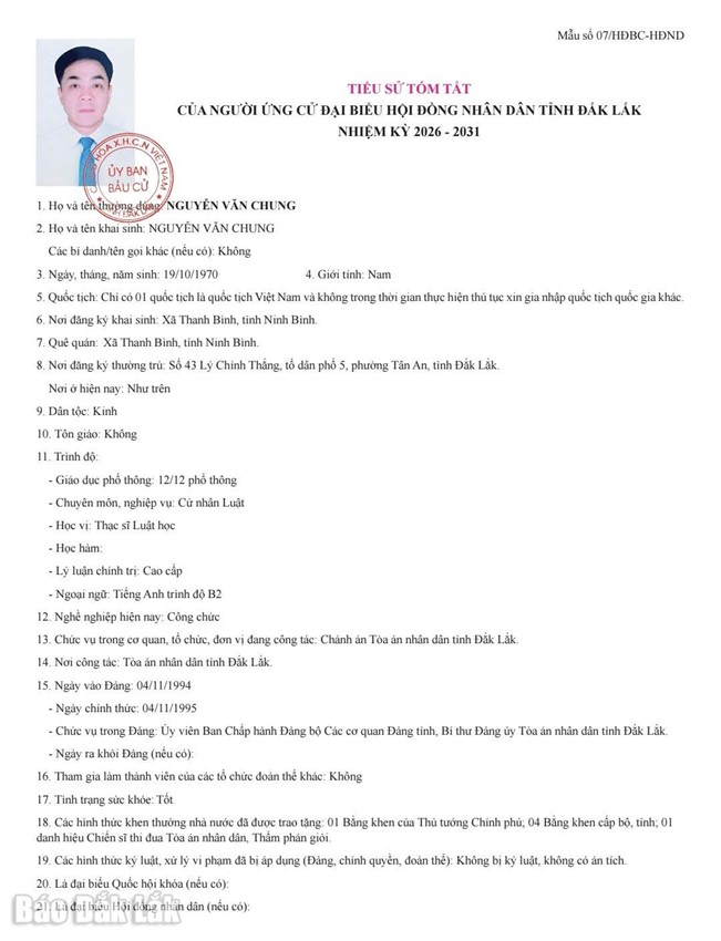 Nhằm tuyên truyền, giúp cử tri nắm rõ thông tin về người ứng cử đại biểu Hội đồng nhân dân tỉnh Đắk Lắk nhiệm kỳ 2026 – 2031, Tòa án nhân dân tỉnh Đắk Lắk trân trọng giới thiệu tiểu sử tóm tắt đồng chí Nguyễn Văn Chung, Chánh án Tòa án nhân dân tỉnh Đắk Lắk, ứng cử viên đại biểu Hội đồng nhân dân tỉnh Đắk Lắk nhiệm kỳ 2026 – 2031 tại Đơn vị bầu cử số 17 gồm các phường: Thành Nhất, Ea Kao và xã Hòa Phú.